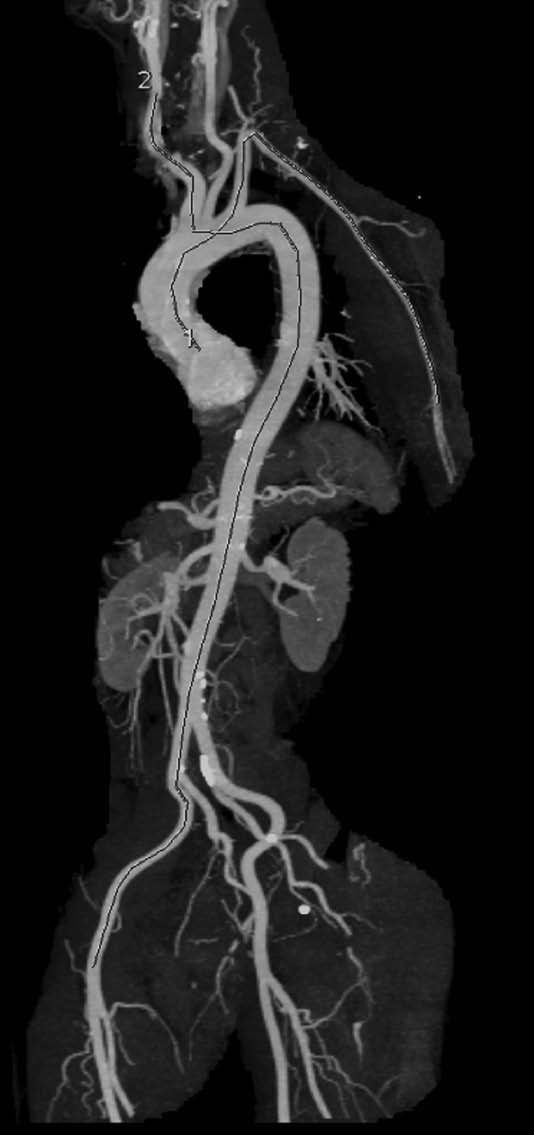The trajectories of the pressure pulse waves along the arterial segments are superimposed onto an angiogram obtained by computed tomography scan (left anterior oblique). The carotid-femoral pathway is described as dotted line, and the QKD pathway is described as dashed line.