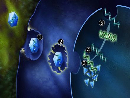 AAV entry. 1 indicates receptor binding and endocytosis; 2, escape into cytoplasm; 3, nuclear import; 4, capsid disassembly; 5, double-strand synthesis; and 6, transcription.