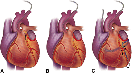 Antegrade coronary artery infusion. A, Coronary artery infusion. The vector is injected through a catheter without interruption of the coronary flow. B, Coronary artery infusion with occlusion of a coronary artery: The vector is injected through the lumen of an inflated angioplasty catheter. C, Coronary artery infusion with simultaneous blocking of a coronary artery and a coronary vein: The vector is injected through an inflated angioplasty catheter and resides in the coronary circulation until both balloons are deflated.