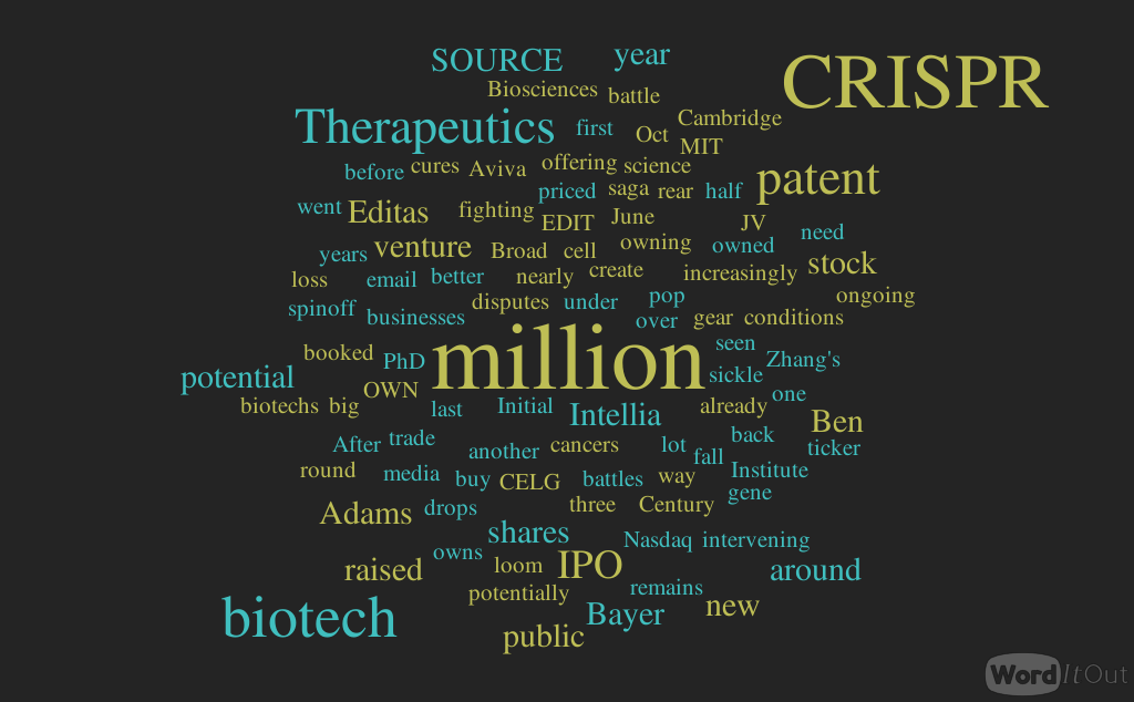 Switzerland and Cambridge, MA-based CRISPR Therapeutics priced its IPO at $14 a pop for 4 million shares, bringing home $56 million. This is less than the $94.4 million raised by Editas in February and the $108 million from Intellia Therapeutics in May.