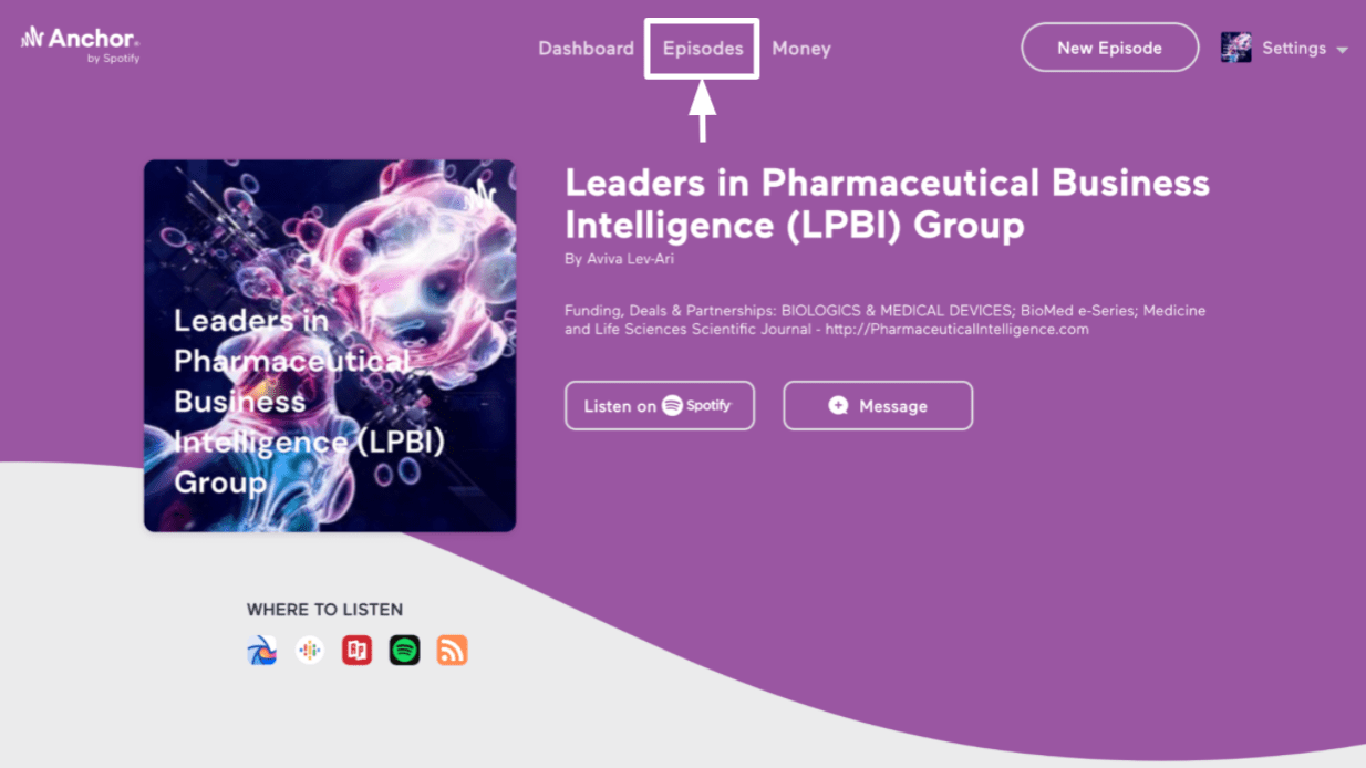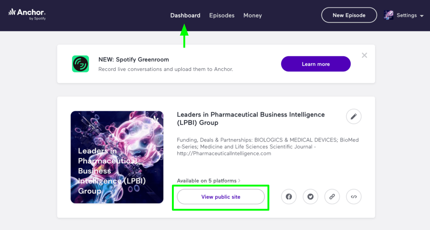 When on Anchor, make sure you are on the Dashboard. There, you should see a button that says “View public site”. Click this button.