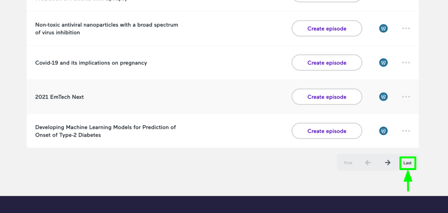 Once you are in Episodes, select the button in the bottom right that says “Last”. This will take you to where all published podcasts are.