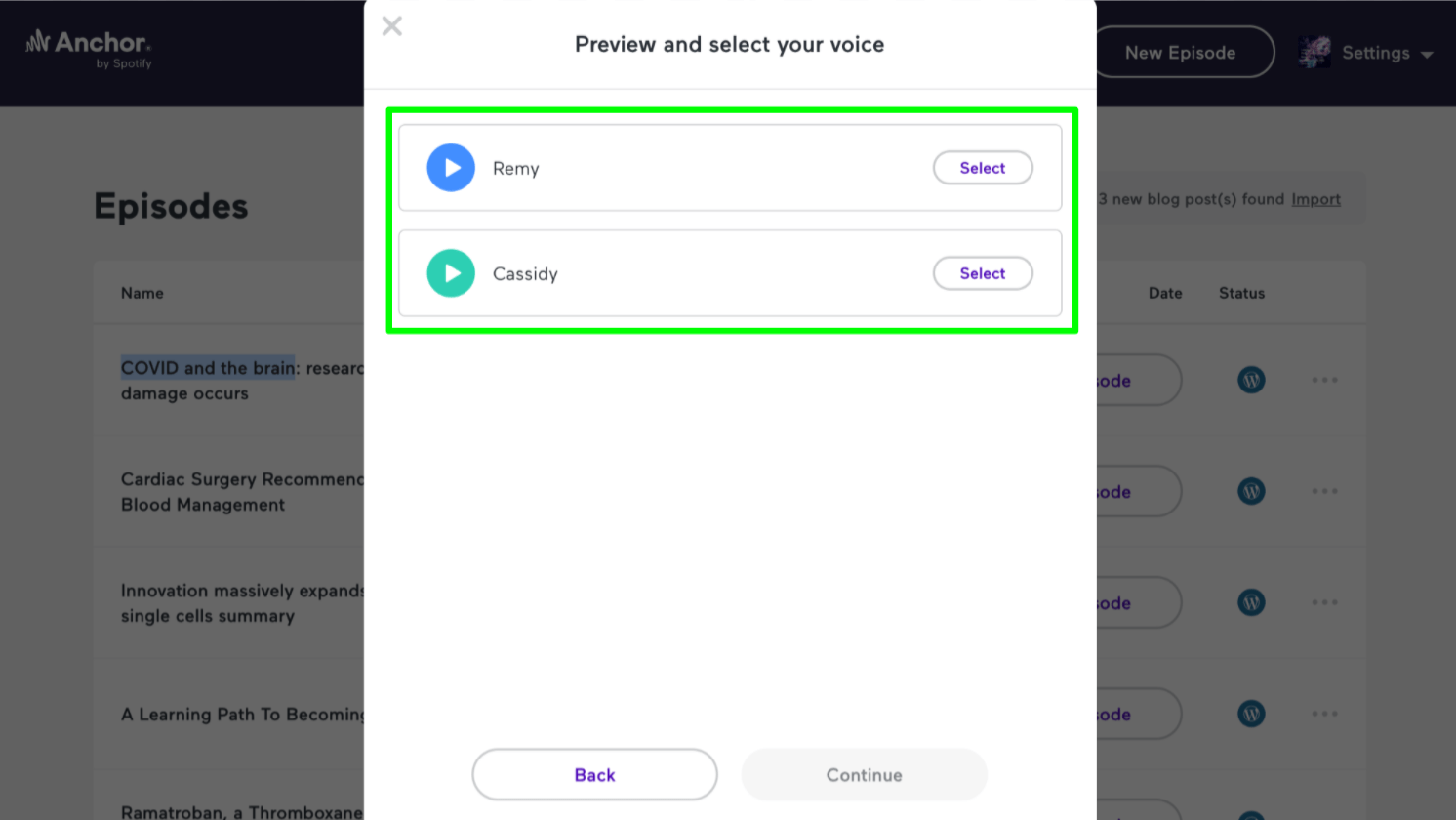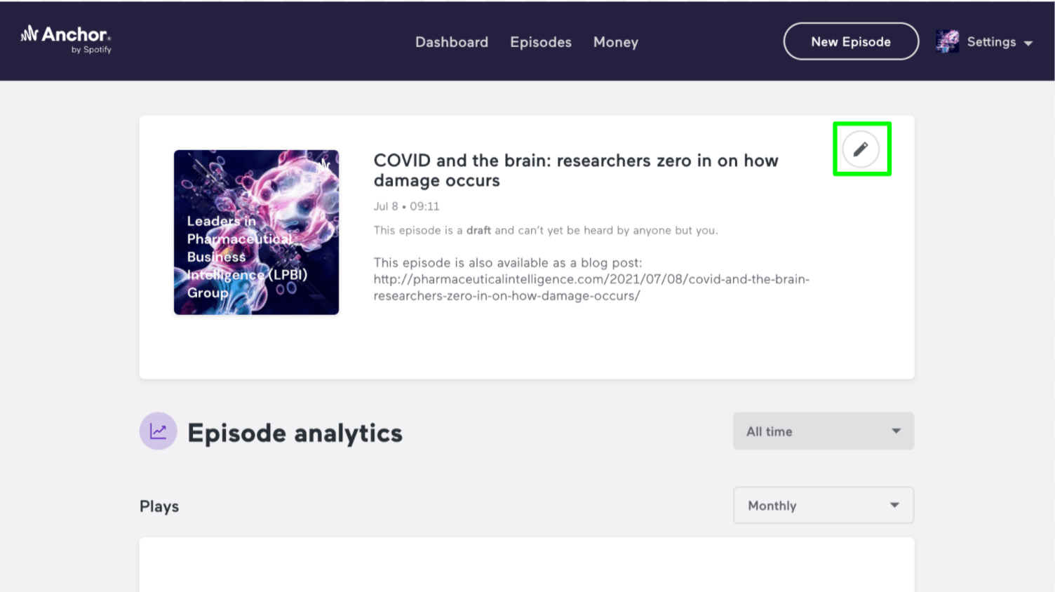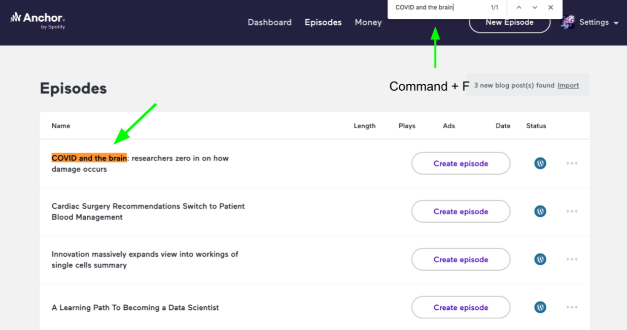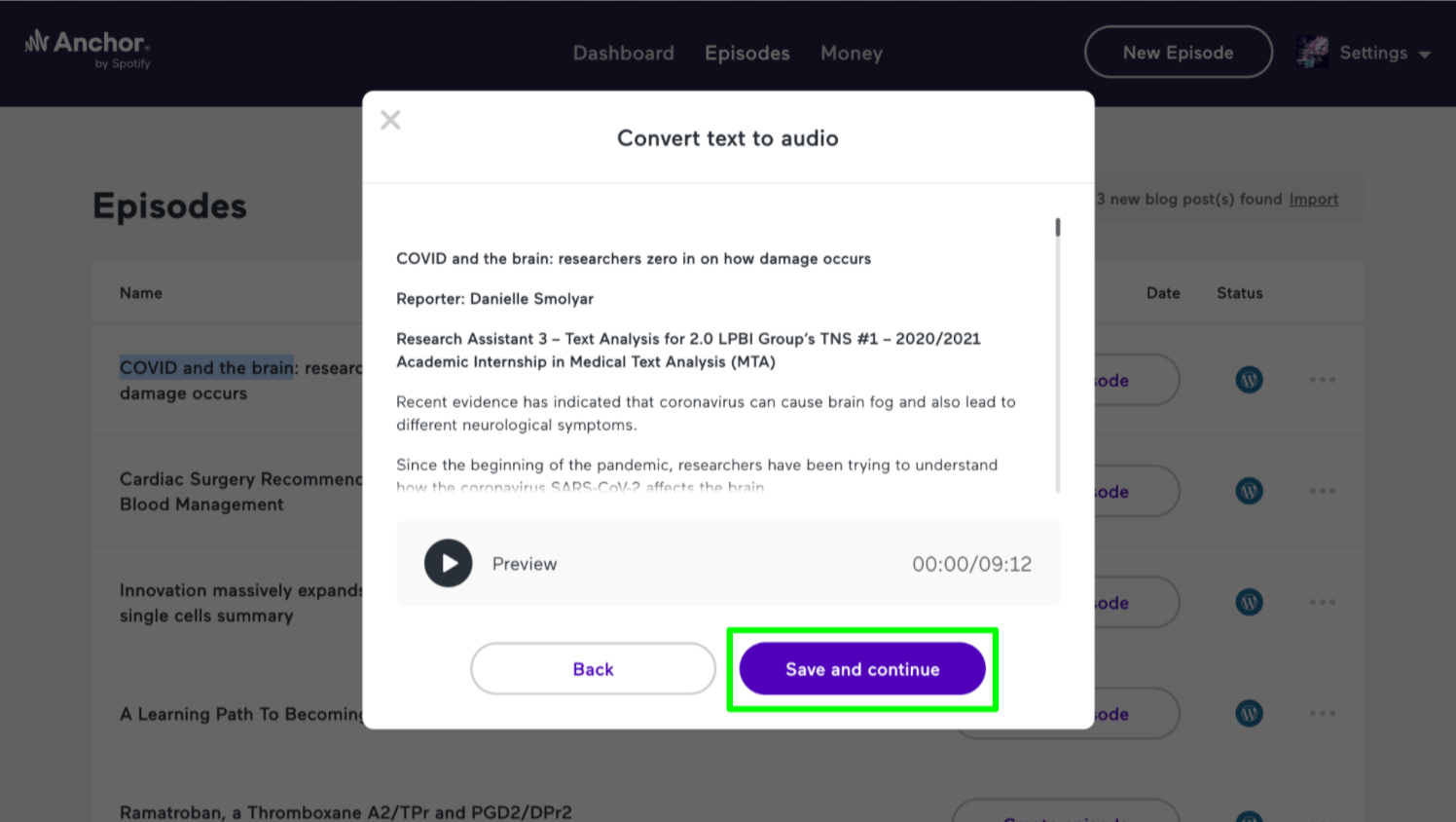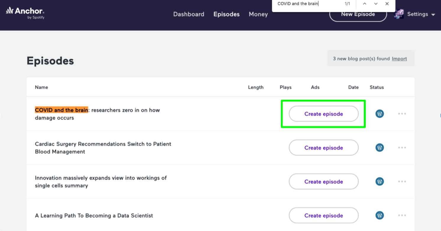This will then take you to a page on Spotify instead of Anchor. Here, you will see all articles published using your anchor account. It may take a couple minutes for recently converted articles to show up on this page.