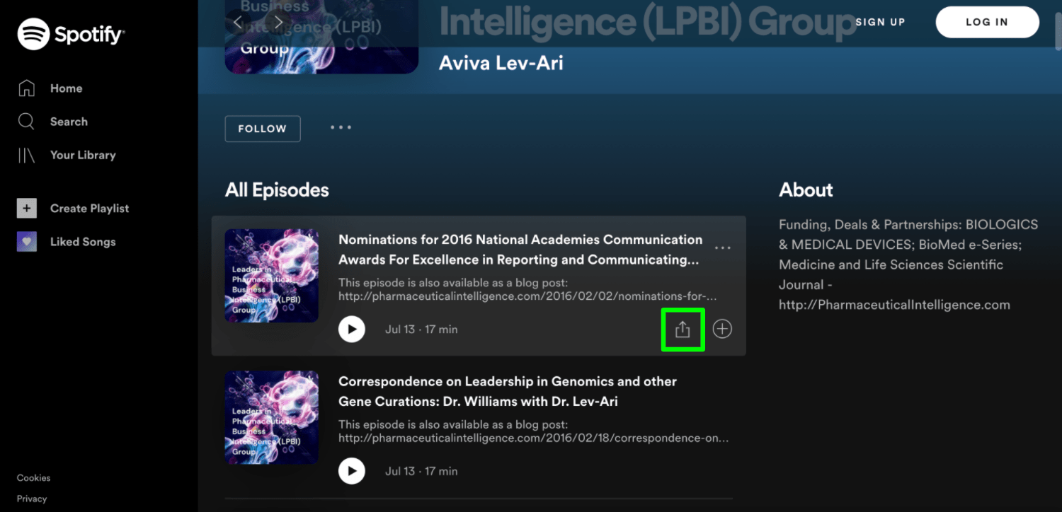 Once you see your podcast title, when you hover your mouse over the podcast, a box with an arrow pointing upwards will appear in the bottom right of your highlighted podcast. When you click this button, it will copy a link to your podcast on Spotify. You will use this link to embed your podcast.
