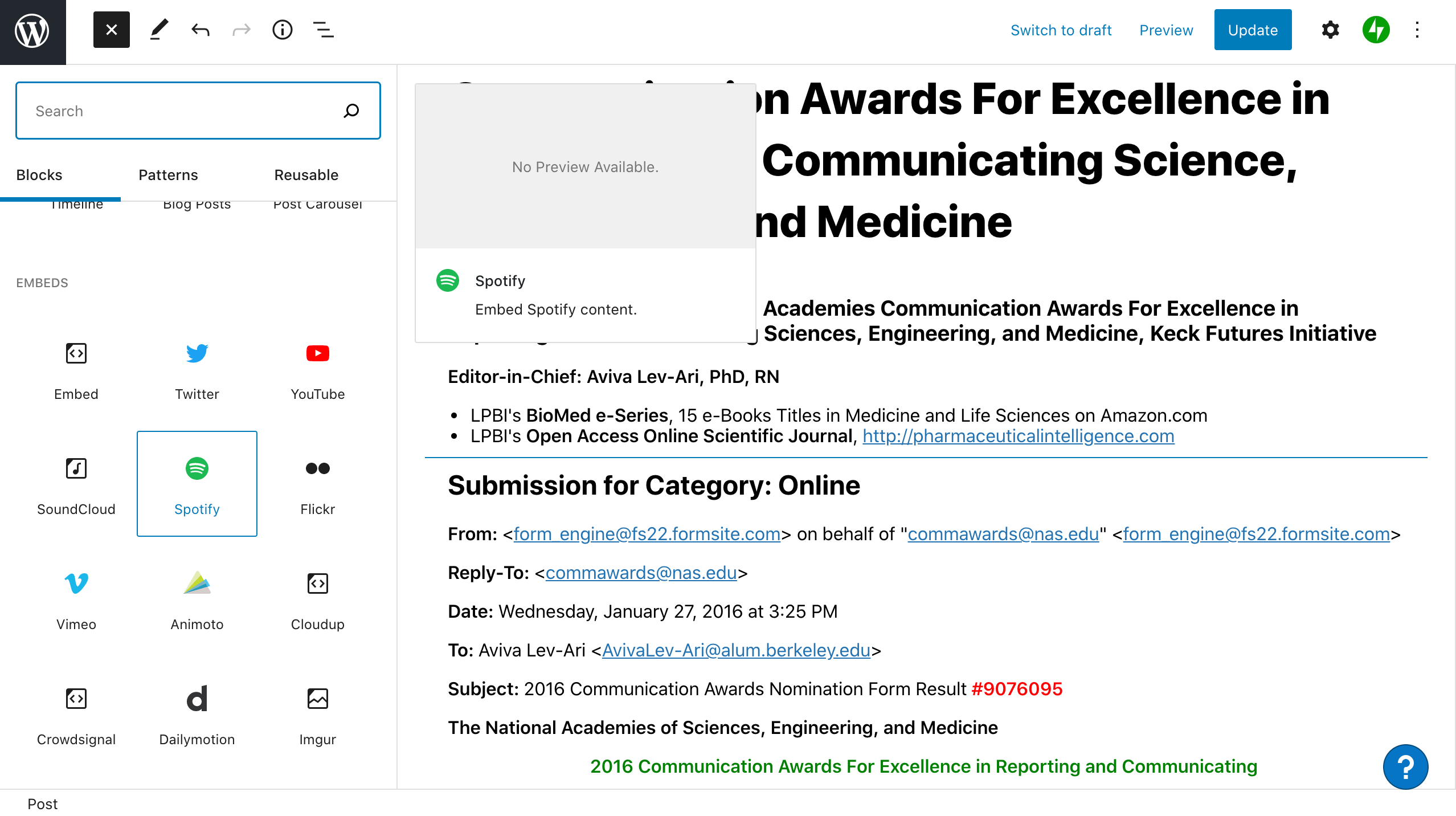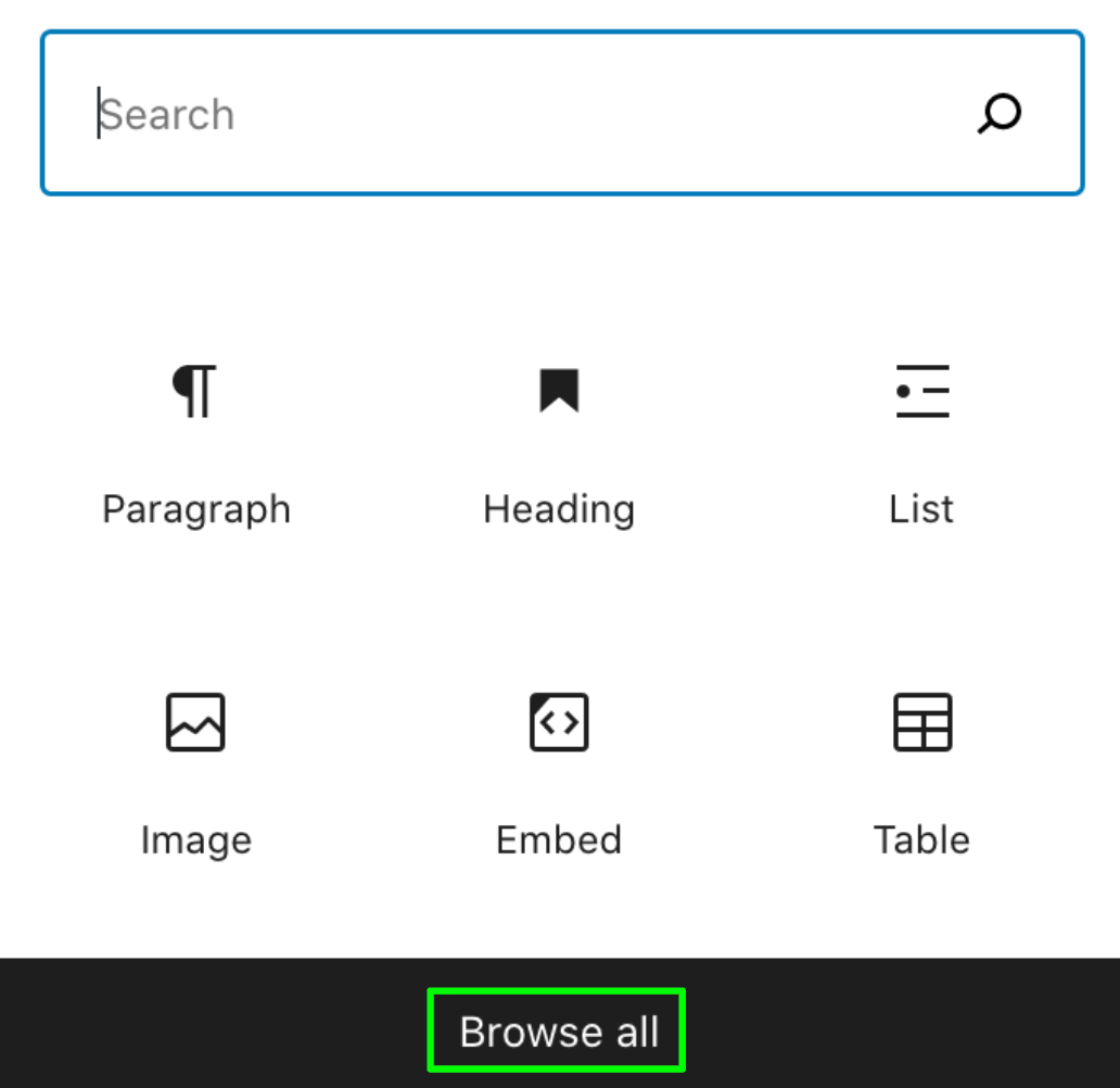 Returning back to your WordPress article, insert a block where you would like your podcast to be embedded. When you press the plus button to insert a block, choose the browse all option. Scroll all the way down to embeds and select the one with the Spotify icon.