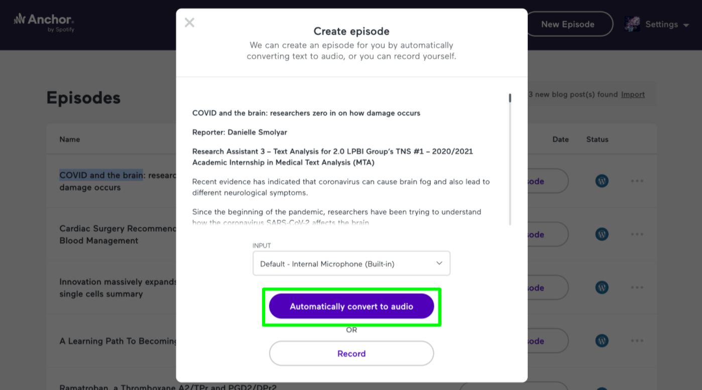 *As of the writing of these steps, the Anchor feature that converts articles to podcasts is relatively new. As of my most recent communication with representatives of Anchor, they are planning on adding features that would simplify this process.