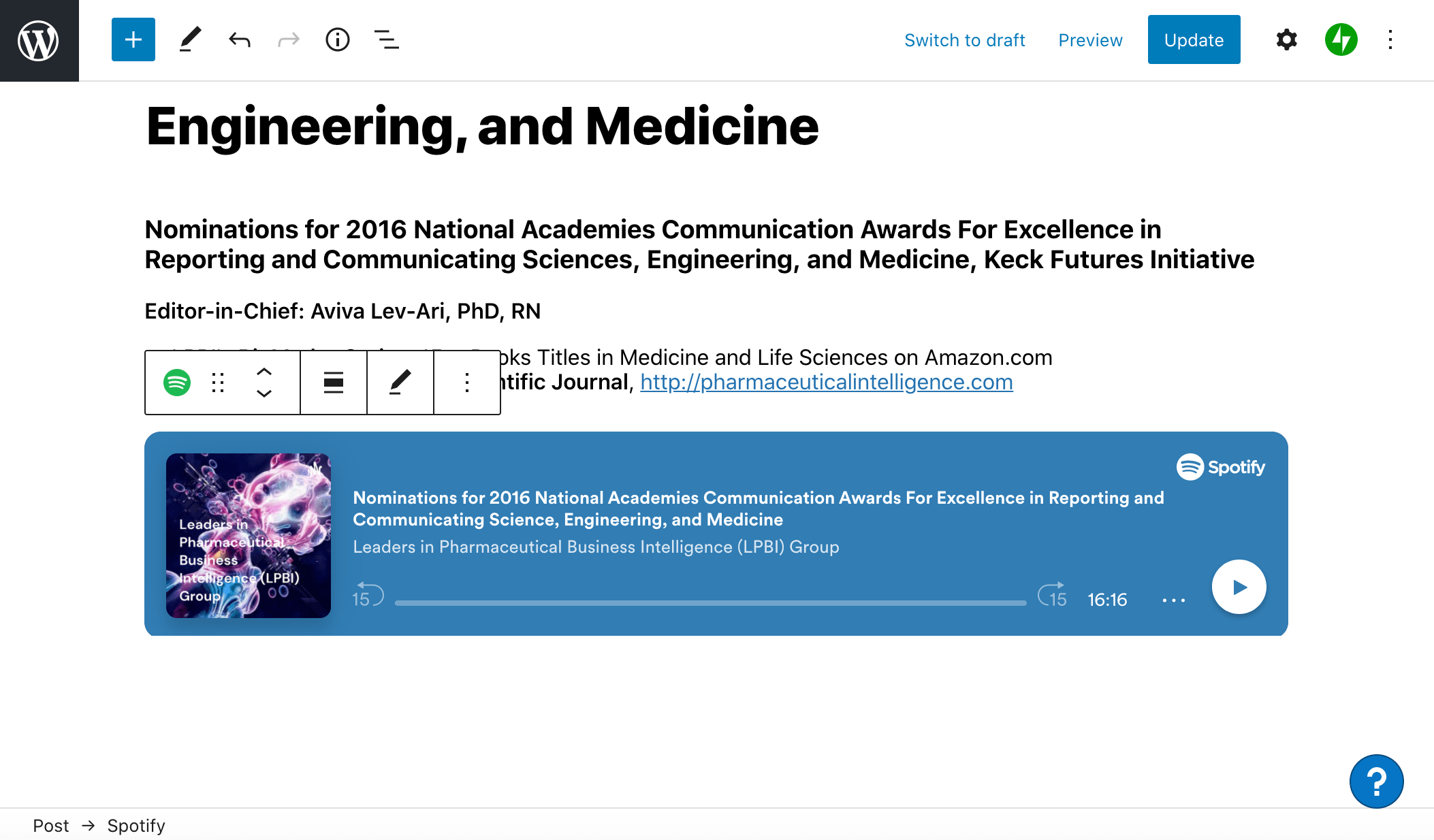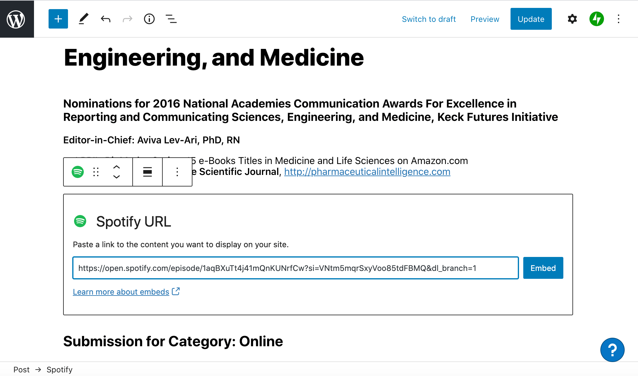 You will then be able to past the link you previously copied from Spotify, and your podcast will now be embedded.
