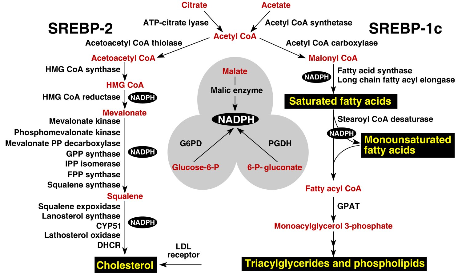 major metabolic intermediates in the pathways for synthesis of cholesterol, fatty acids, and triglycerides