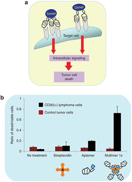 Aptamer-based biotherapy. (a) Schema showing receptor oligomerization-inducing downstream signaling. CD30-associated signaling is activated by its ligand through trimerization of the receptor, leading to varied outcomes that range from apoptosis to proliferation. (b) CD30-positive and -negative cells were incubated without any treatment or in the presence of control streptavidin, monomeric aptamer, and multimeric aptamer. Following 72-hour incubation, the multivalent CD30 aptamer induced cell death in the CD30-positive lymphoma cells, but had no effect on the CD30-negative control cells. Ratio of the dead/live cells was calculated by costaining the cells with Hoechst 33342 (live cells) and propidium iodide (dead cells).
